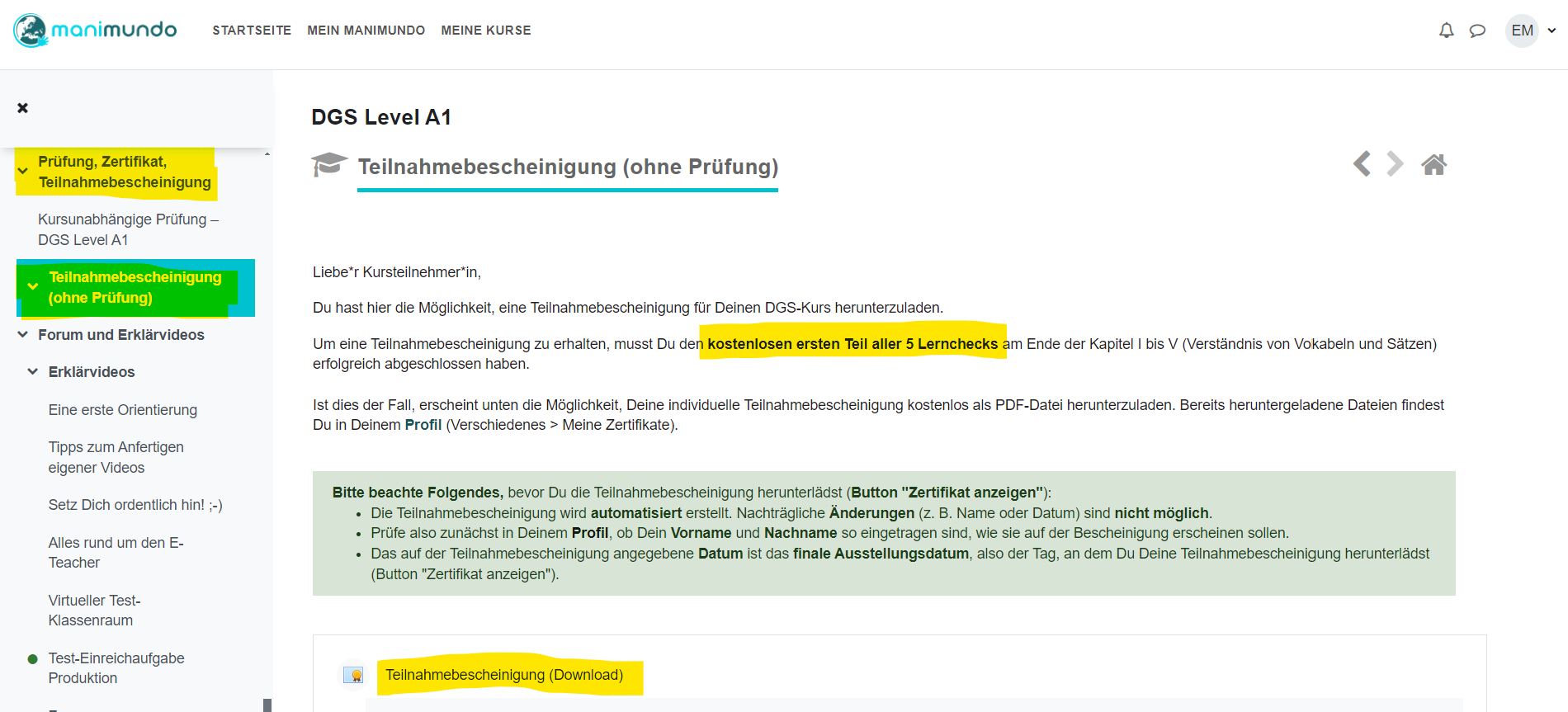 Bitte beachte Folgendes, bevor Du die Teilnahmebescheinigung herunterlädst